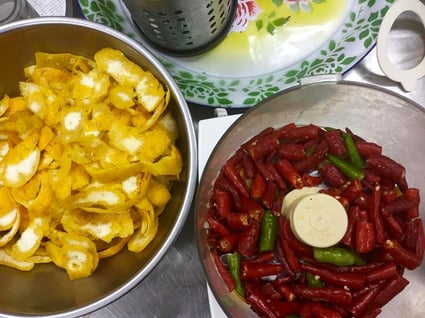 5 唐辛子の形が崩れたら、その中へ柚子果汁を絞ります。